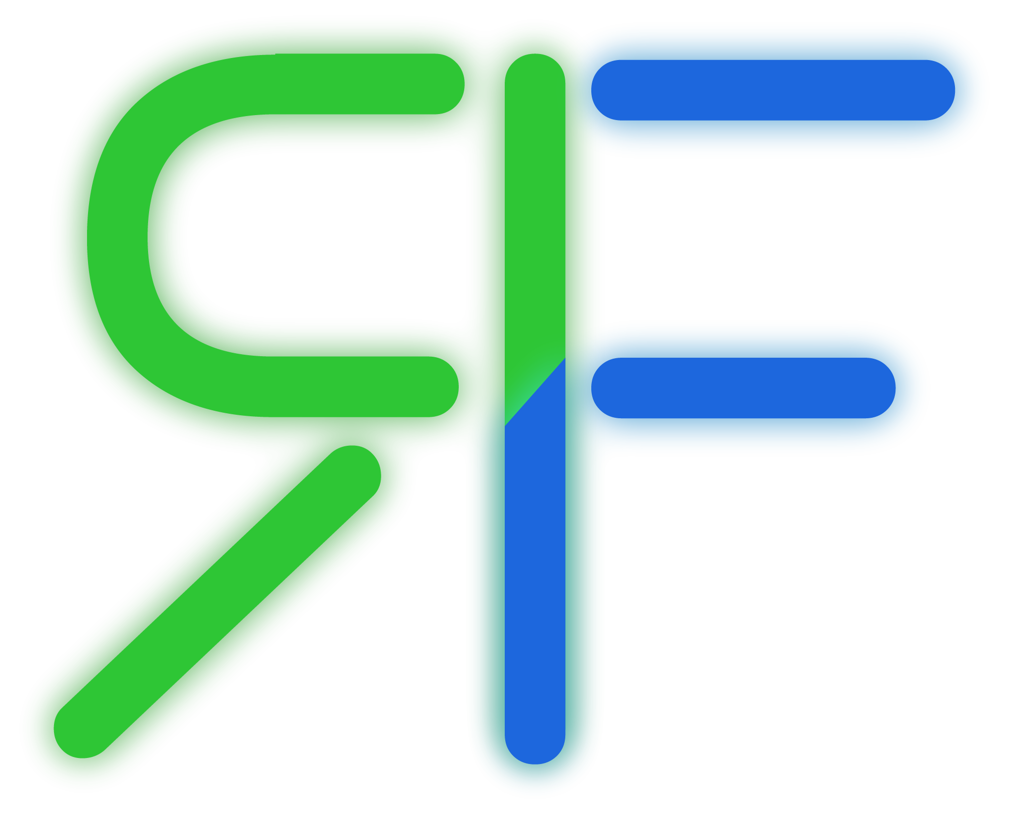 Logo d’entrainement, avec les initials «RF» pour Robin Favereau, avec des couleurs flash et en neon faisant penser aux écran d’ordinateur.