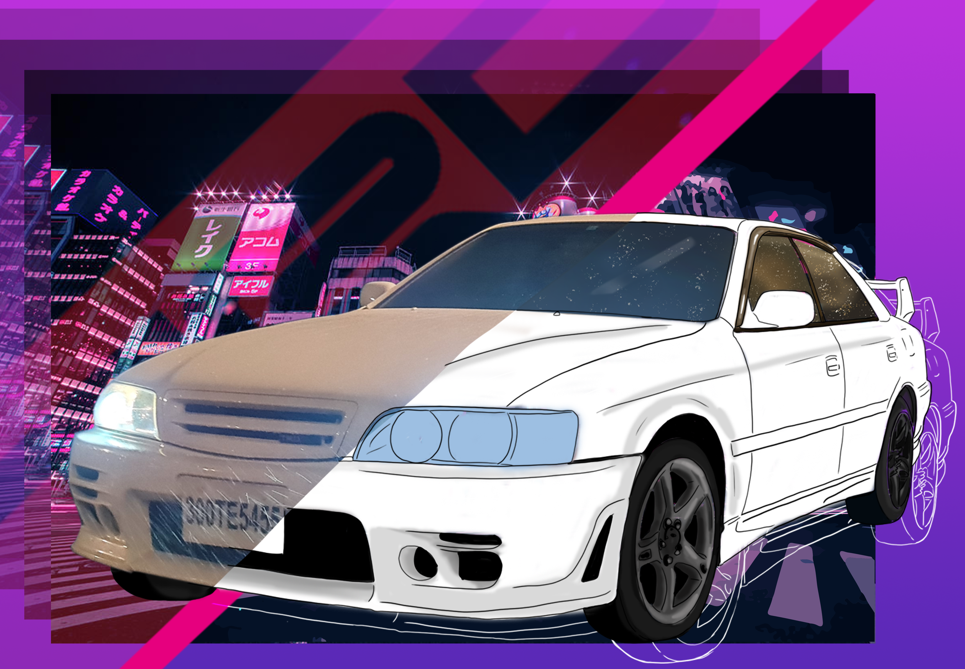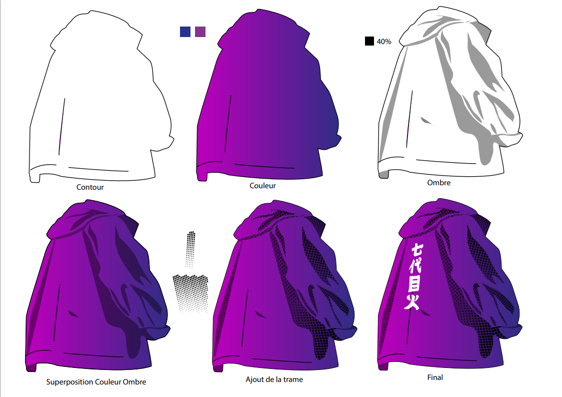 Voici les différentes étapes du dessin sur la photographie du modèle streetwear de gauche.