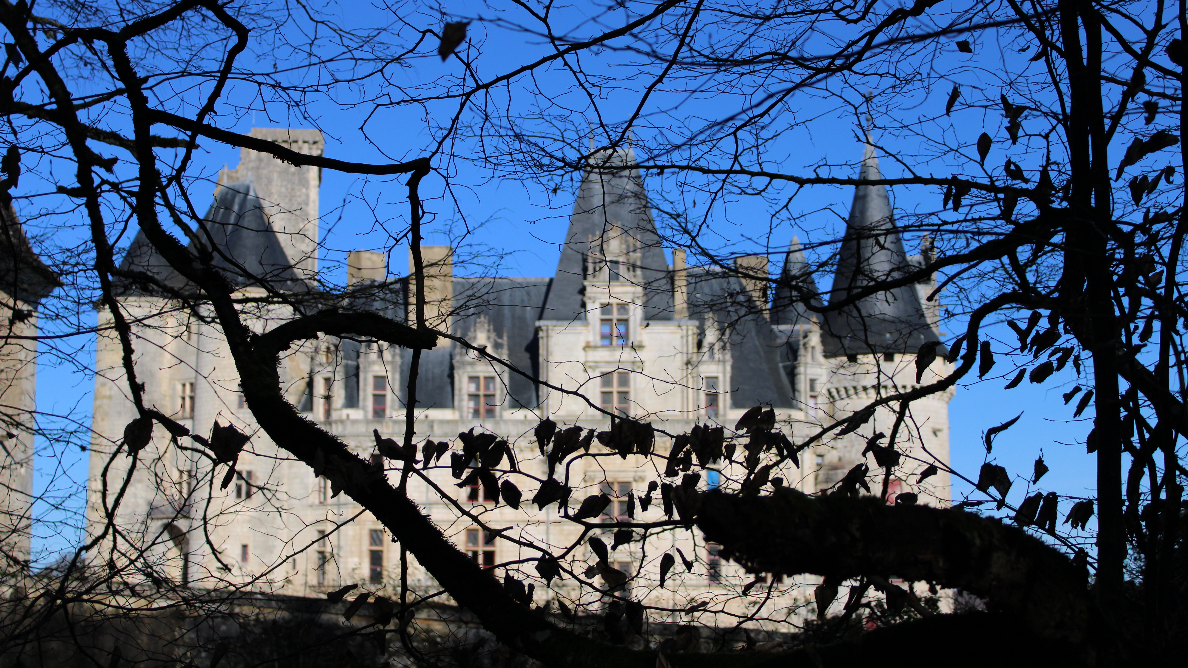 Photographie d'un couché de soleil d'hiver derrière des branches d'arbre.