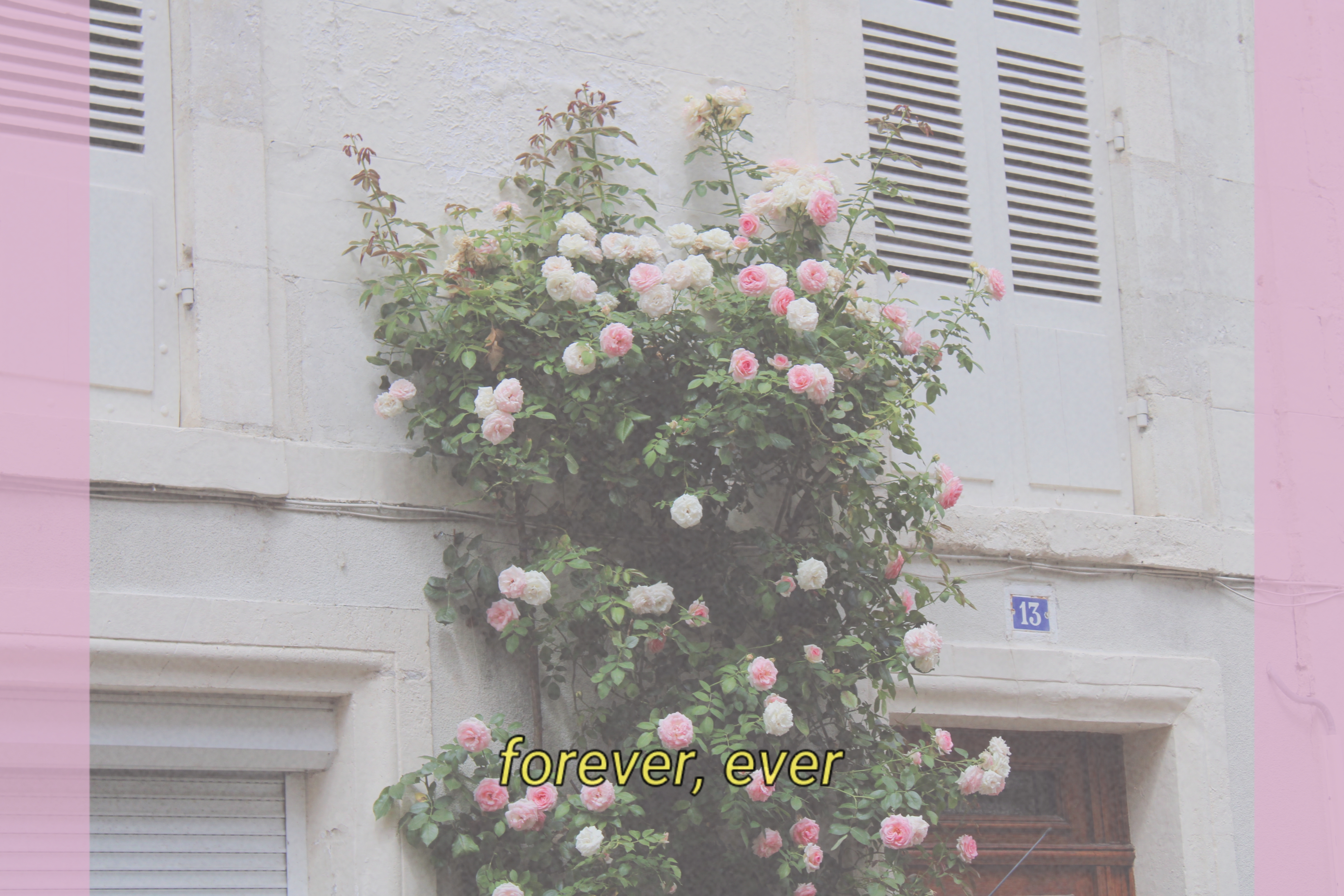 Photographie des roses retouchée en y élevant l'exposition et en ajoutant des bandes roses transparantes et une petite phrase pour donner un air d'aestetisme.