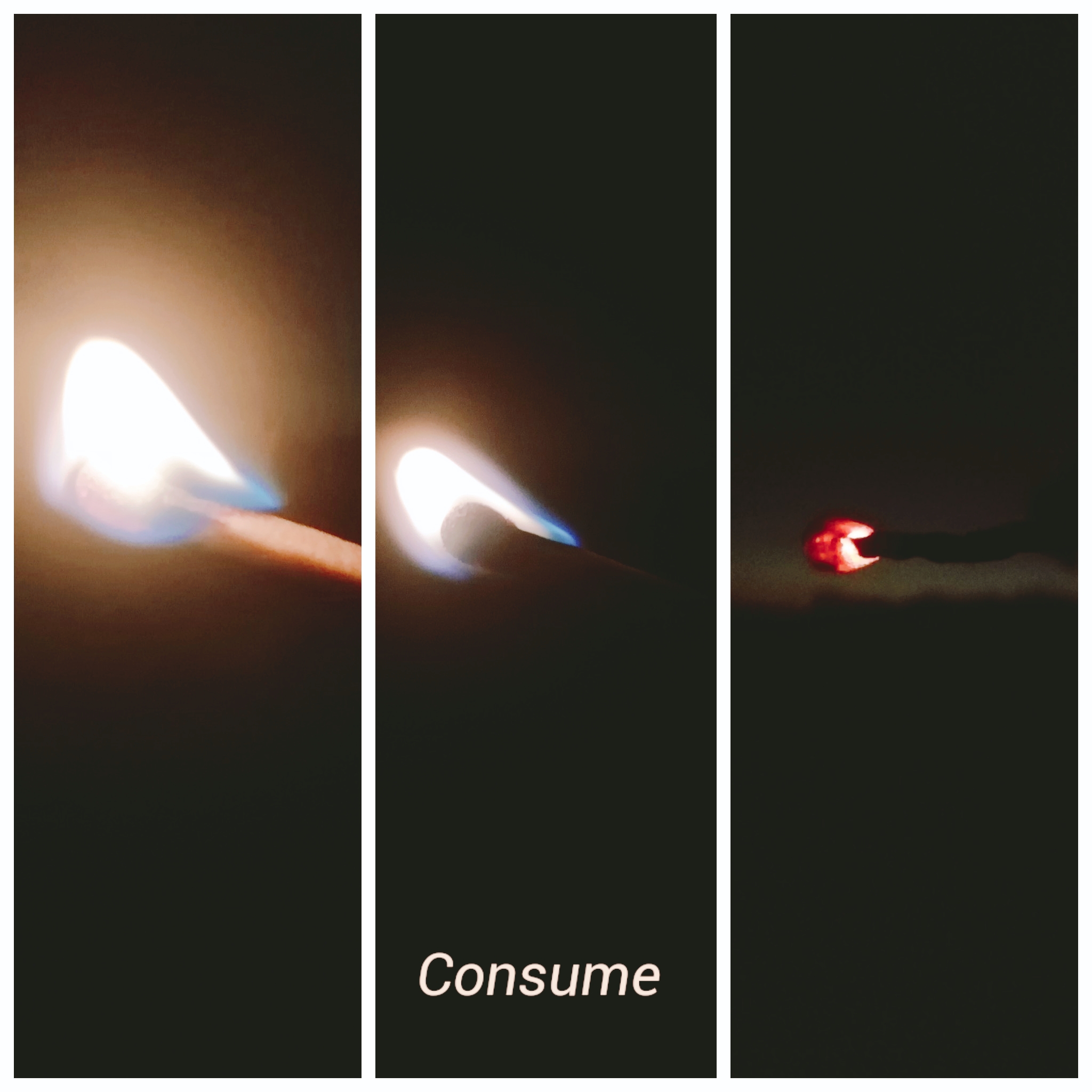 Montage de 3 photographies d'une allumette qui s'éteint, nous plongeant dans le noir petit à petit.