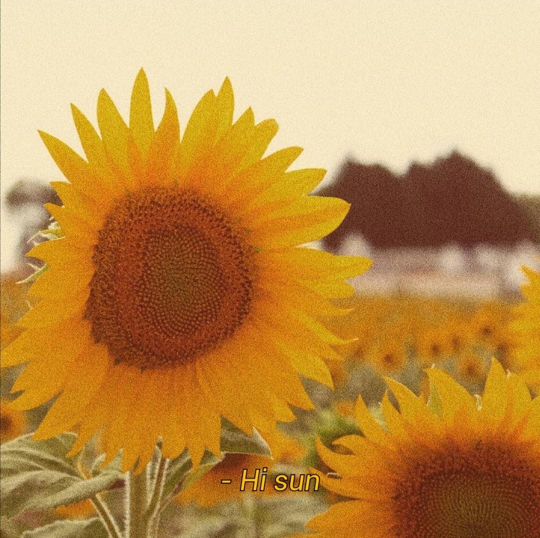 Photographie des tournesols recadrée et retouchée en y ajoutant du grain, une saturation chaude et une phrase.