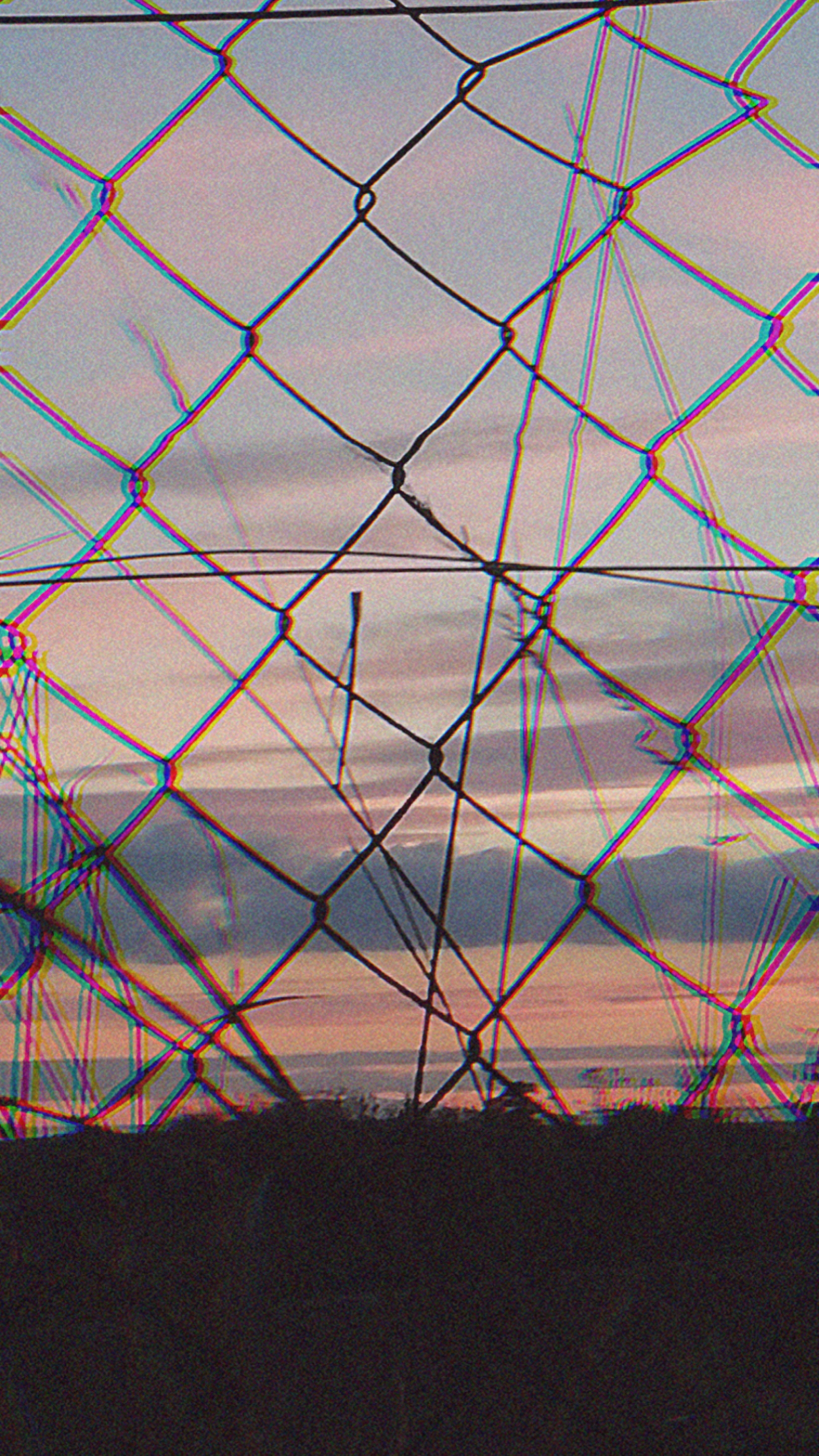 Photographie prise avec un téléphone portable à travers un grillage pendant un couché de soleil et retouchée en y ajoutant du grain et un effet glitch.