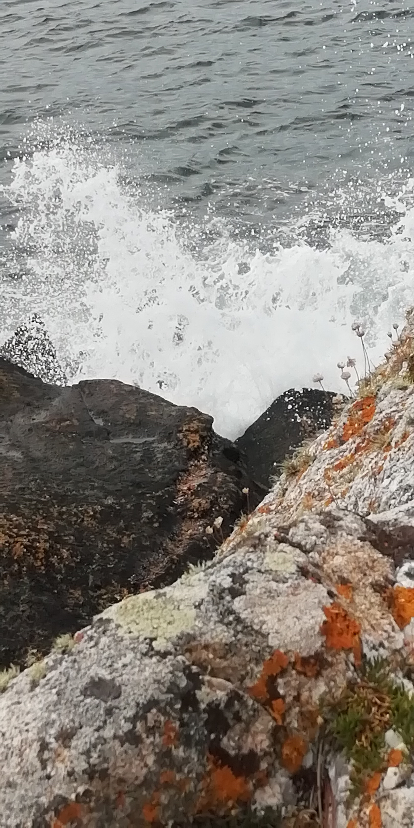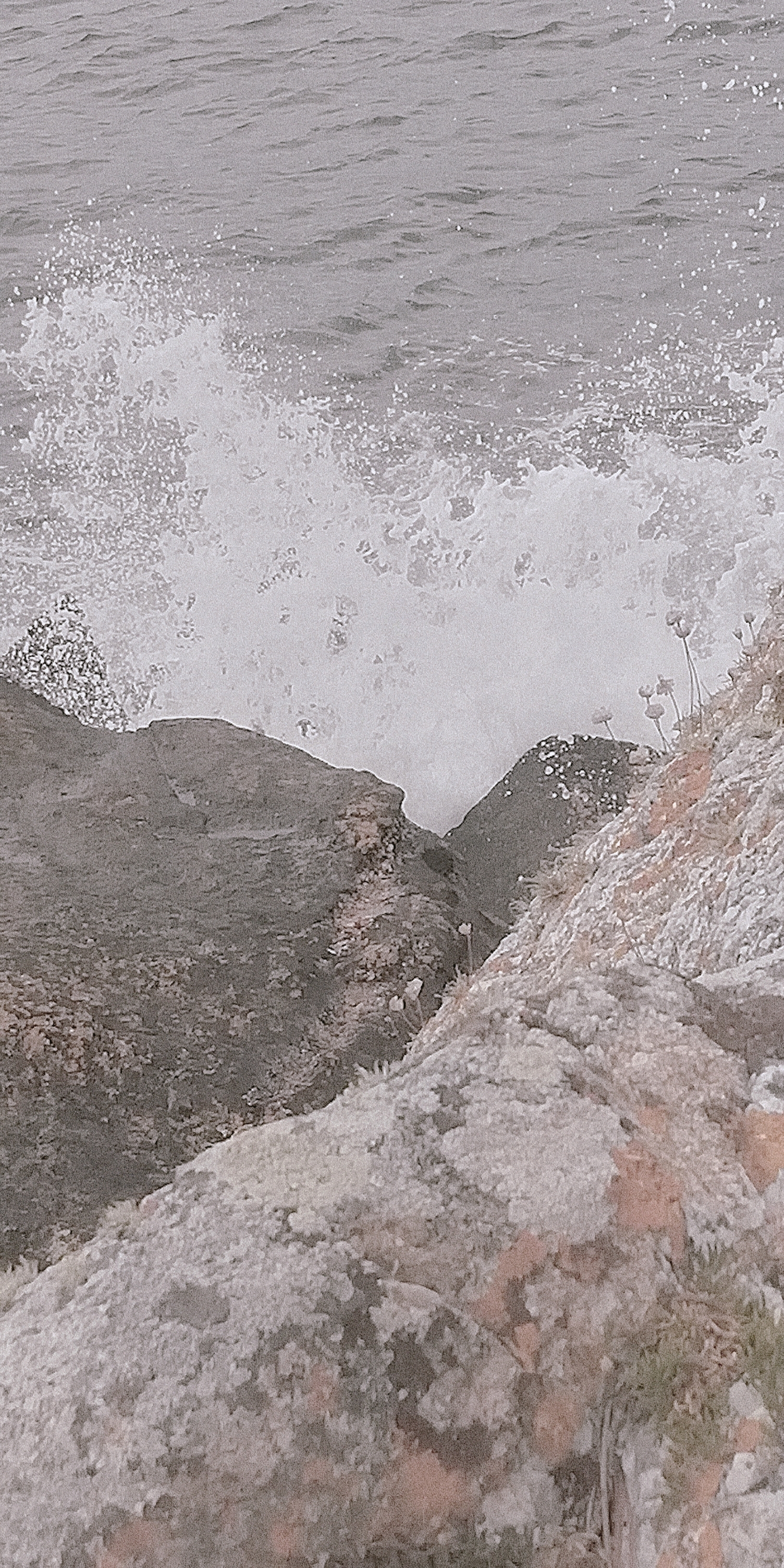 Photographie originel d'une vague qui frappe les rochers prise avec un téléphone portable.